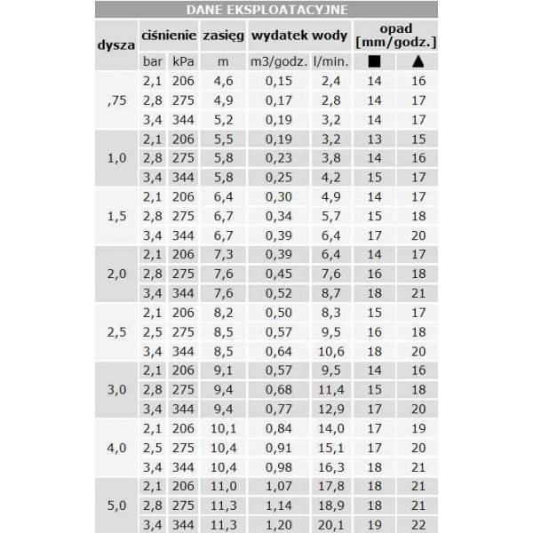 Duża precyzja konstrukcji umożliwia zmianę zasięgu zraszania od 4,3 metra do aż 10,7 metra przy ciśnieniu zasilania jedynie 1,7 bara. Jest to szczególnie ważne w systemach nawadniania zasilanych z sieci miejskiej gdyż często w sezonie letnim dochodzi do czasowego obniżenia ciśnienia w sieci z powodów dużego jej obciążenia.